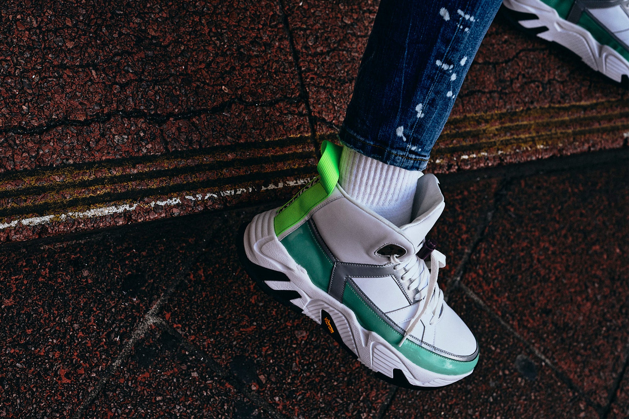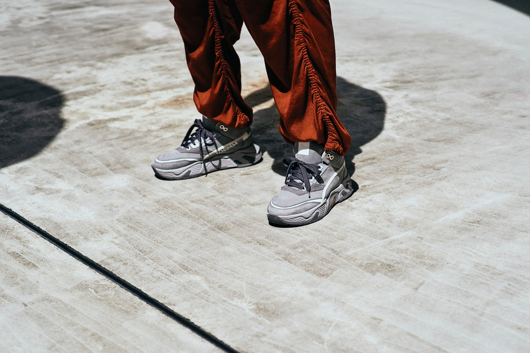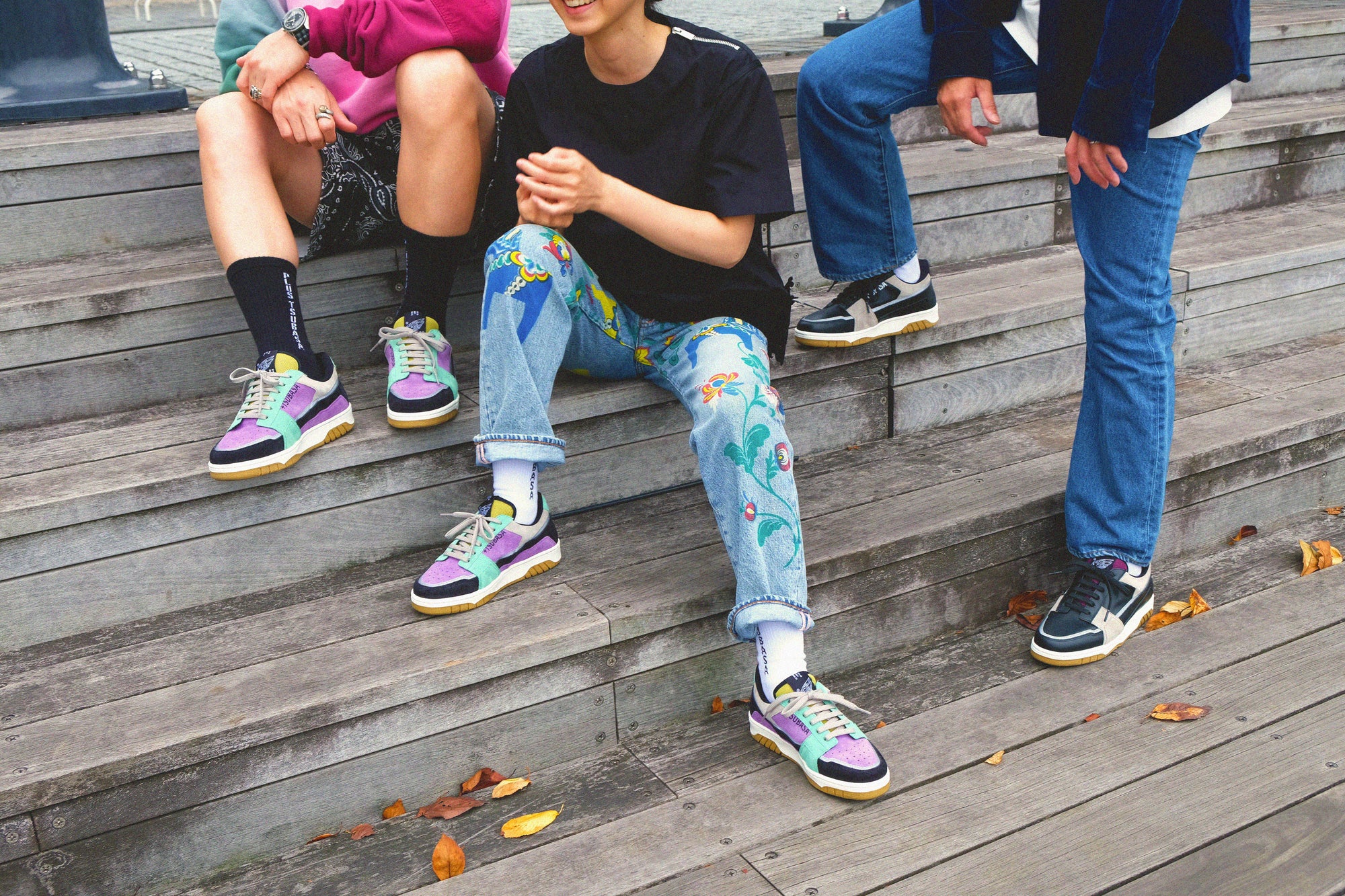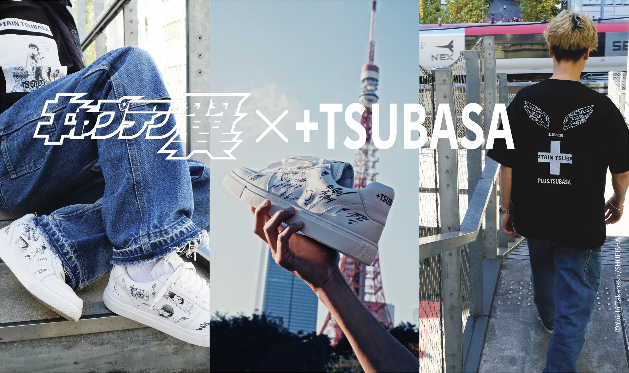 漫画『キャプテン翼』に散りばめられた躍動感あふれるオノマトペとともに中学編決勝戦の印象的なシーンを集結、+TSUBASAのNEWモデルスニーカー「ビュンビュン」に全面プリントしました。