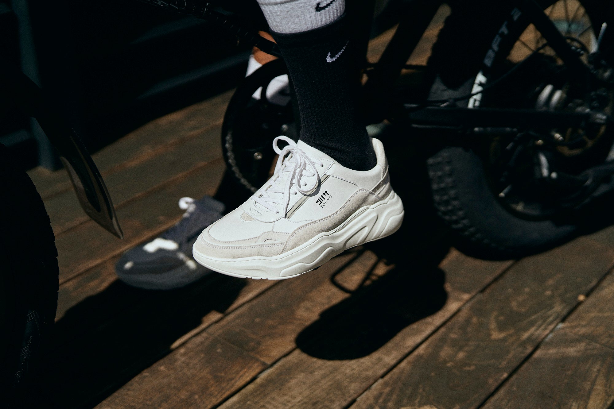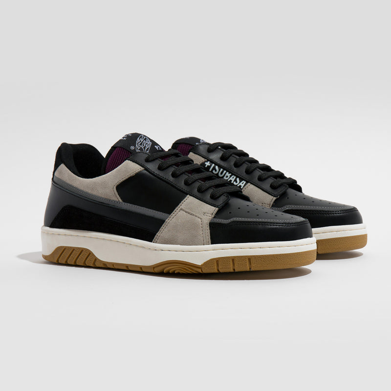 りんごのリサイクル素材と、クロムフリー(有害物質を含まない)スエードで、潔く黒一色。ベーシックなブラックはとにかく何にでも合わせやすい。FIDLOCKの赤いグログランテープと+TSUBASAの文字がいい具合、さりげないポイントに。こちらのモデルもアウトソールは70%リサイクルラバー。インソールもライニングも環境を考えた素材。「意識しないでいつの間にかサステナブル」、これが私たちが目指すところです。