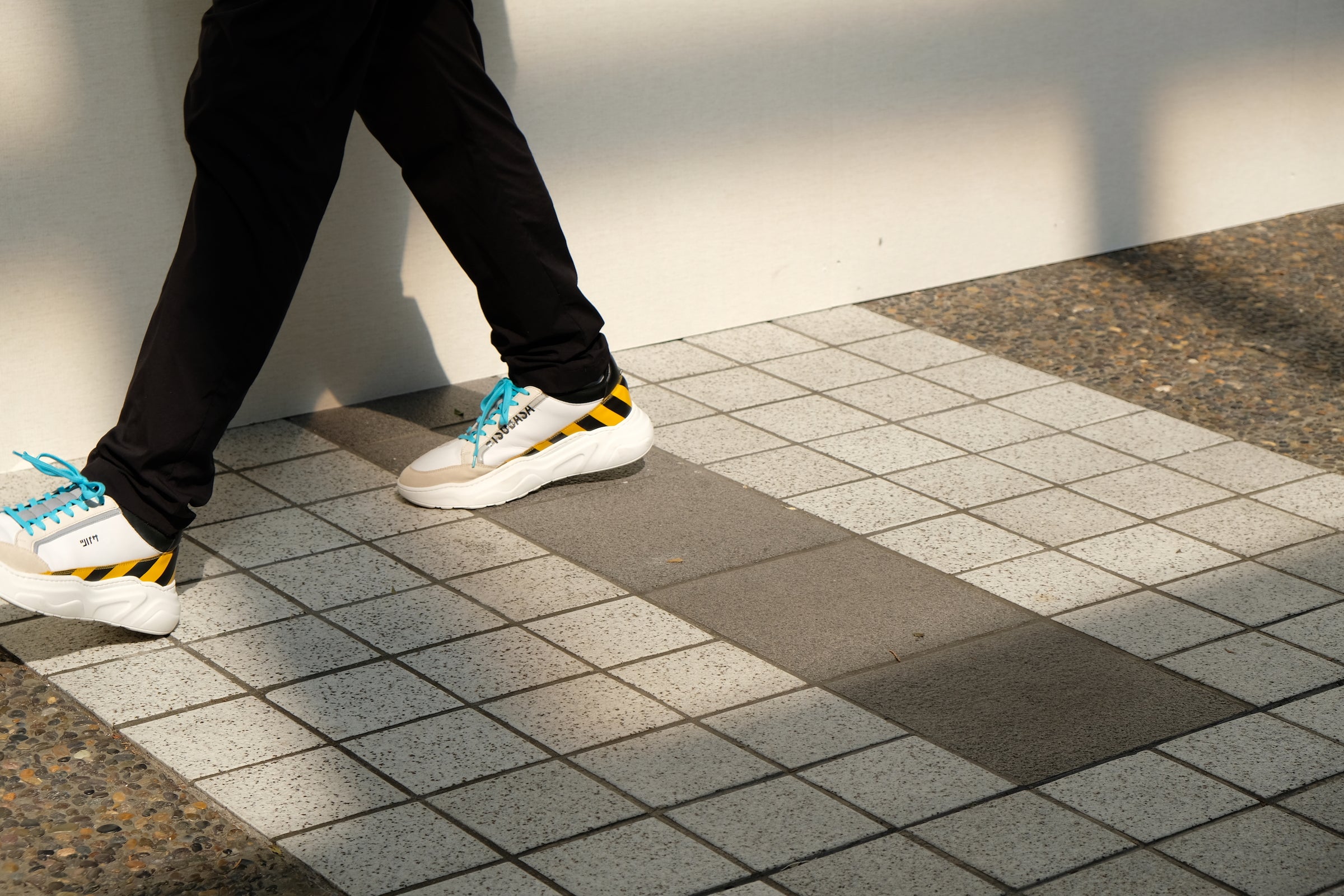 イエローにブラックストライプのデザインが足元を主張します。中央に走るリフレクターが反射。黒の履き口が全体の印象を引き締めます。